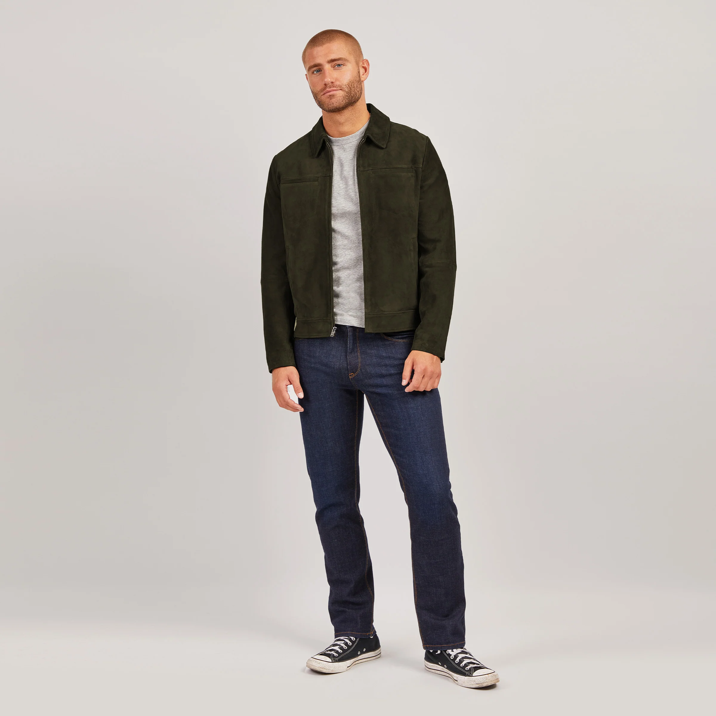 - Inspired by the classic trucker jacket, our Mott & Bow version is crafted from 100% genuine goat suede. Meticulously designed for the discerning dresser, this piece is unparalleled in its elegance and sophistication.